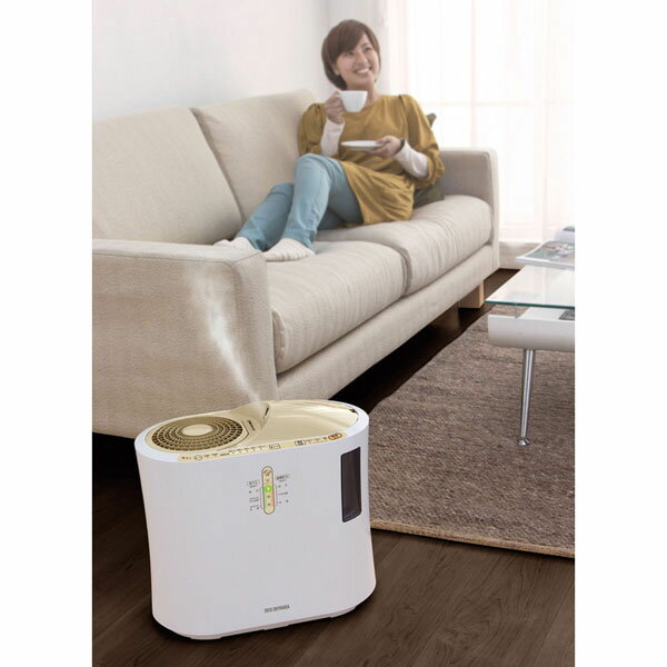 ヒーターで温められた水が超音波振動によって霧状(ミスト)になり室内を加湿する、強力ハイブリッド加湿器(加熱式+超音波式)。