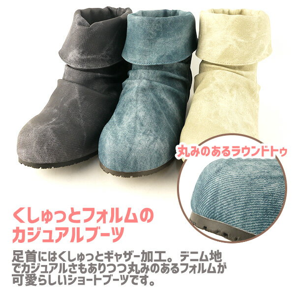 デニム地でカジュアルさもありつつ丸みのあるフォルムがかわいらしいショートブーツです。